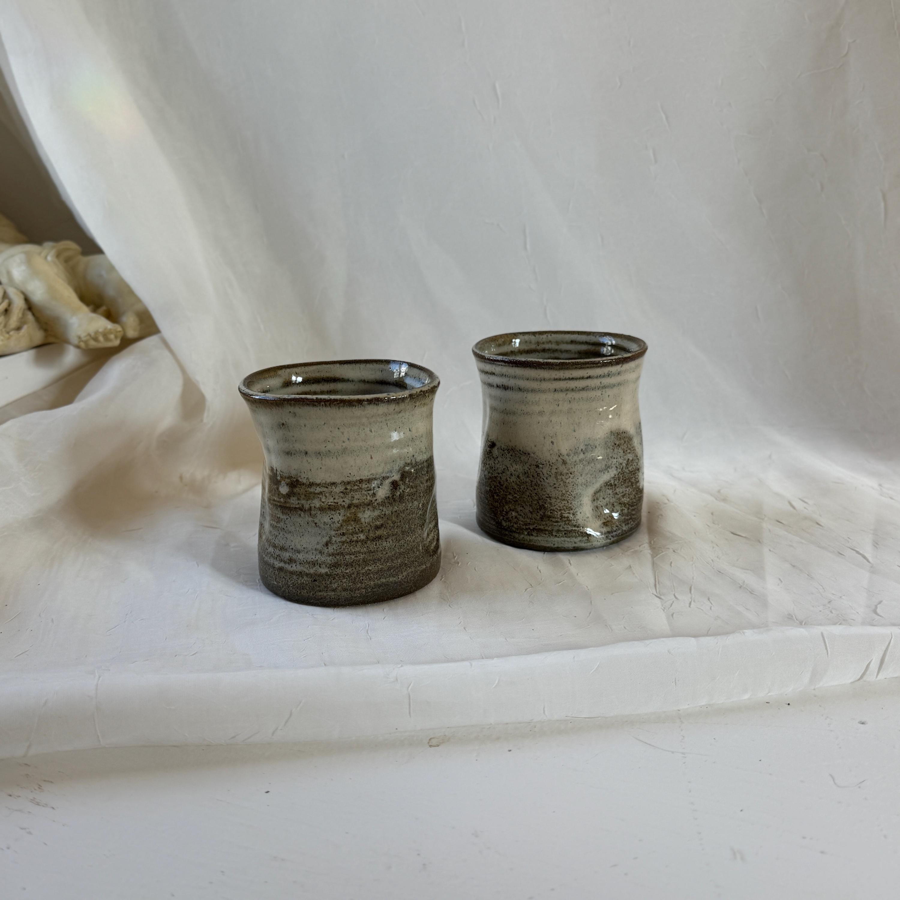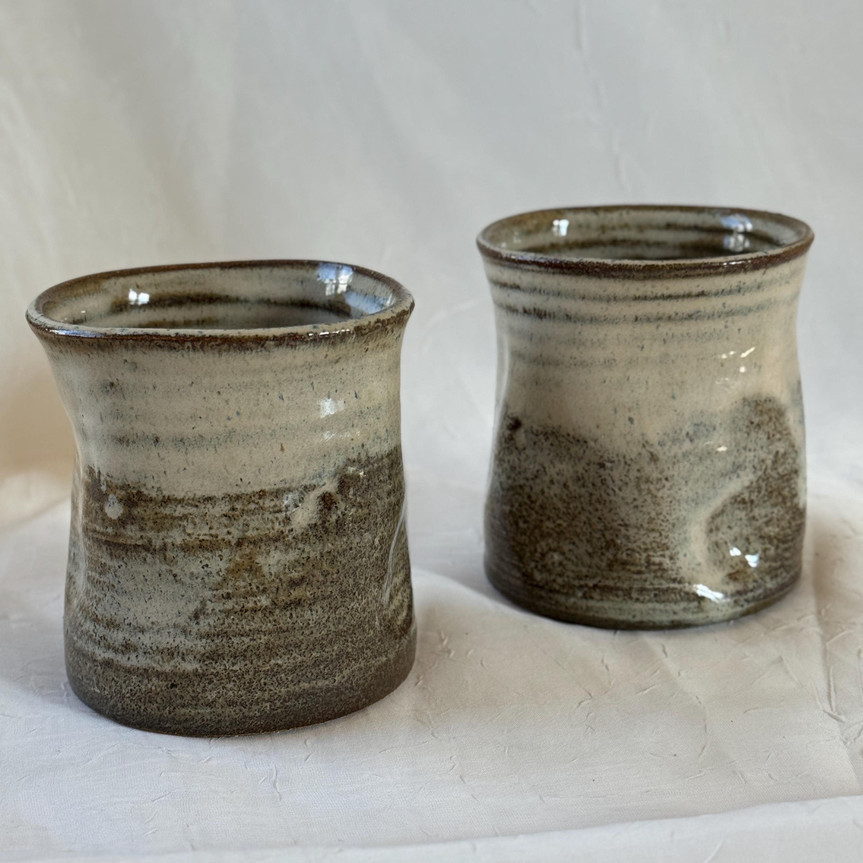 Wheel thrown tumbler cup set made from stoneware clay with glossy green and white glaze.
