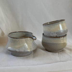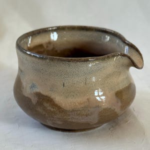 Wheel thrown matcha chawan made from stoneware clay with neutral speckled glaze.