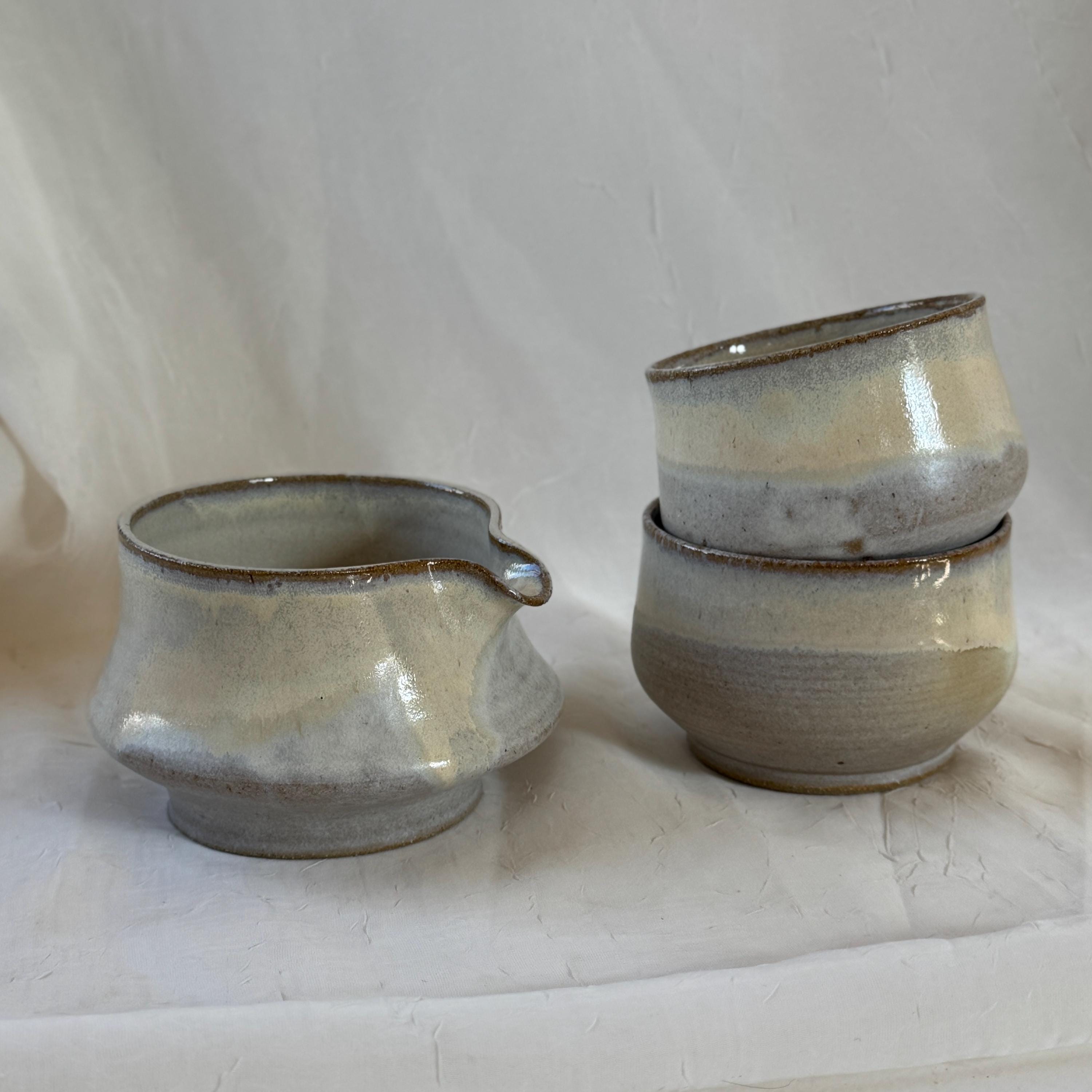 Wheel thrown matcha chawan and cup set made from stoneware clay with neutral glossy glaze. The cups are slightly different sizes, not perfectly uniform.