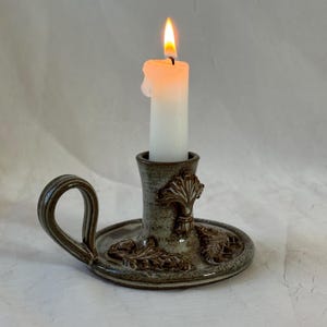 Wheel thrown ceramic taper candle holder made from stoneware clay with neutral matte glaze.