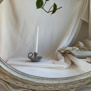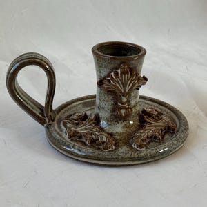 Wheel thrown ceramic taper candle holder made from stoneware clay with neutral glaze.