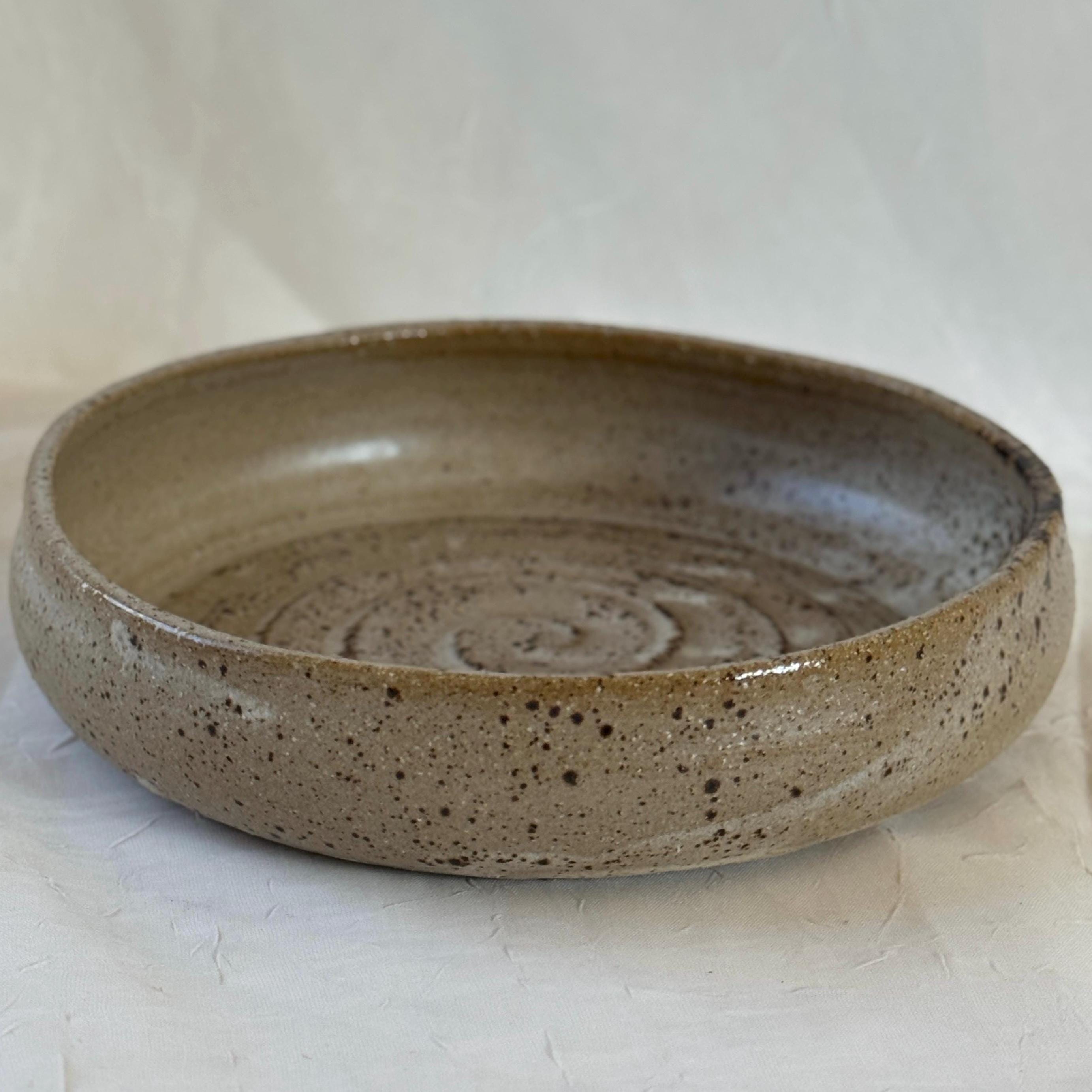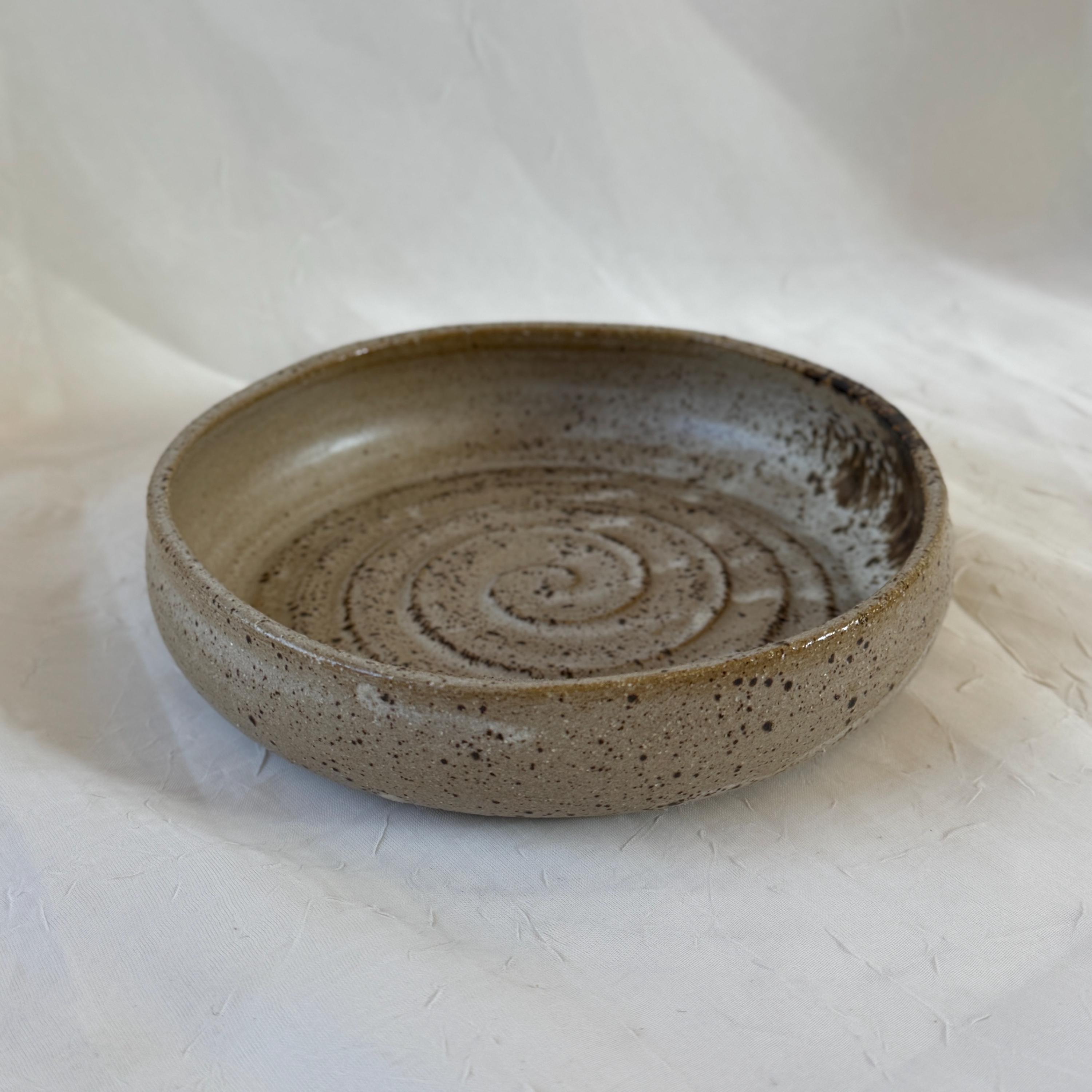 Wheel thrown bowl made from stoneware clay with neutral speckled glaze. Swirl detail inside and imperfect wabi sabi look.